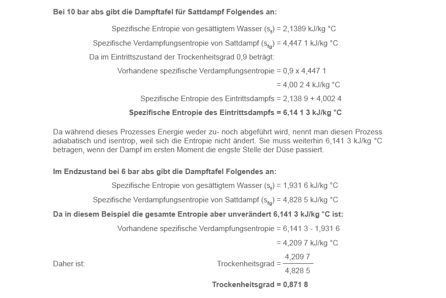 Dies scheint dem adiabatischen Prinzip zu widersprechen, das besagt, dass dem Prozess keine Energie entzogen wird. Wie wir aber in Modul 2.15 gesehen haben, liegt die Erklärung darin, dass der Dampf bei 6 bar abs die Düse mit hoher Geschwindigkeit passiert und demzufolge kinetische Energie aufgenommen hat. Da Energie weder gebildet noch vernichtet werden kann, geht die Zunahme der kinetischen Energie im Dampf auf Kosten seines Energieabfalls.