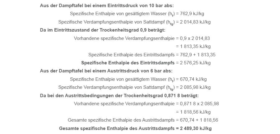 Der abströmseitige Dampf hat 6 bar abs bei einem Trockenheitsgrad von 0,871 8.