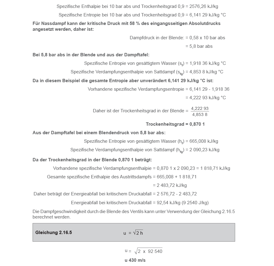 Bestimmen Sie die kritische Geschwindigkeit des Dampfs in der Blende des Regelventils aus Beispiel 2.16.2, bei dem der Ausgangszustand des Dampfes 10 bar abs bei 90 % Trockenheit betrug, und der abströmseitige Druck auf 3 bar abs abgesenkt werden soll.