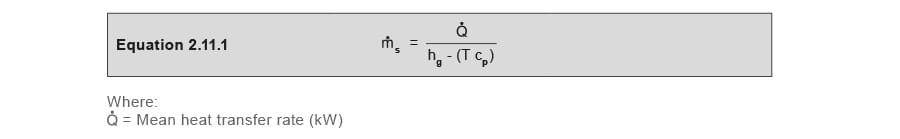 In Equation 2.11.1, the steam consumption rate is directly related to the heat requirement. Unless the steam injection system is designed so that all conditions are conducive to maximum heat transfer, the steam bubbles may simply break the surface of the liquid and escape to the atmosphere; some of the heat contained in the steam will be lost to atmosphere and the actual heat transfer rate to the water will be less than anticipated.