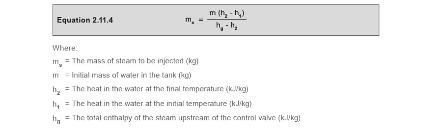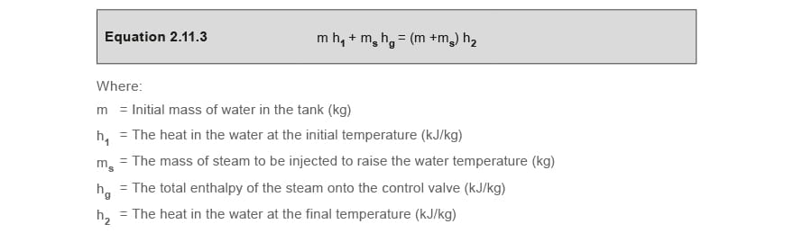 A heat balance is considered where the initial heat content in the water plus the heat added by the steam equals the final heat content. The heat balance equation for the water in the tank is shown in Equation 2.11.3:
