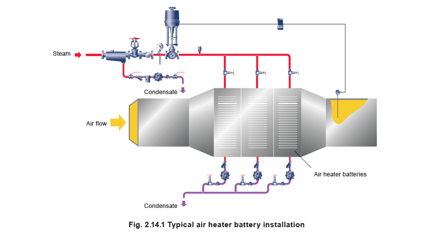 A feature of this type of plant is the small steam space, and a relatively high steam load when warming up from cold. To account for this and the load fluctuations, steam traps should be sized with a factor of 2 times the running load. Temperature control can be very accurate using pilot operated direct acting reducing valves, giving a constant and consistent steam pressure corresponding to the required surface temperature. These are sized simply on the designed steam load.