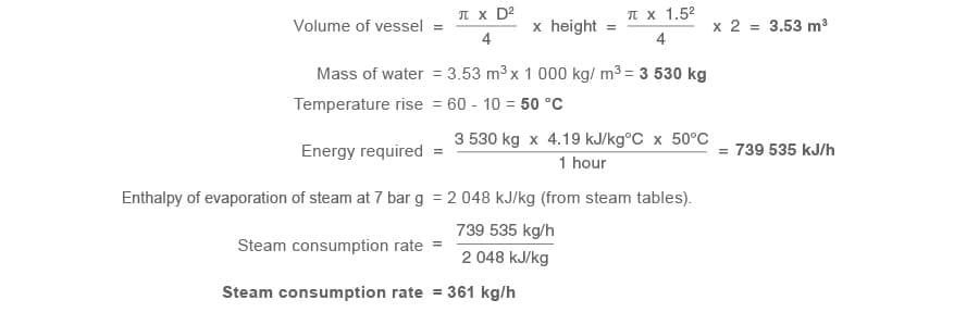 The mass of water to be heated may be determined from the volume of the vessel. (For water, density ρ = 1 000 kg/m³, and specific heat (cp) = 4.19 kJ/kg °C).