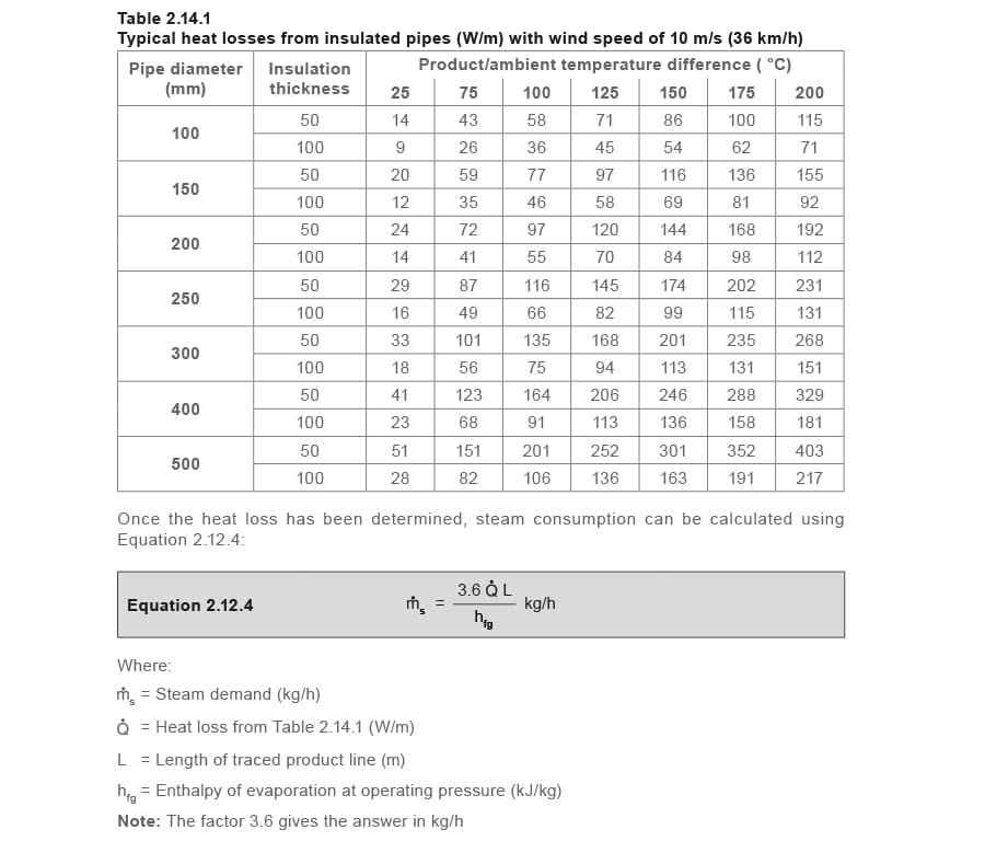 Table 2.14.1 provides heat losses from insulated pipes with either 50 or 100 mm of insulation.
