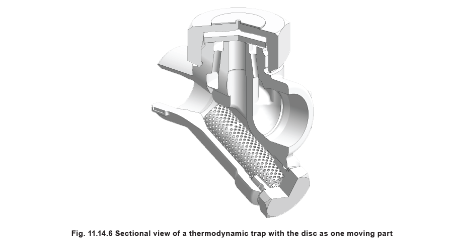 If the seat or disc faces of a thermodynamic trap become damaged, the disc can simply be replaced (Figure 11.14.6). Damage to seating faces can be rectified by lapping gently. Replacing the seats of some higher pressure thermodynamic traps is more complicated. Two separate gasketed joints may have to be made or a single gasket may have to cope with two or more steam/condensate passages. The weakest point is often the joint between trap body and seat, particularly if this has been allowed to blow steam.
