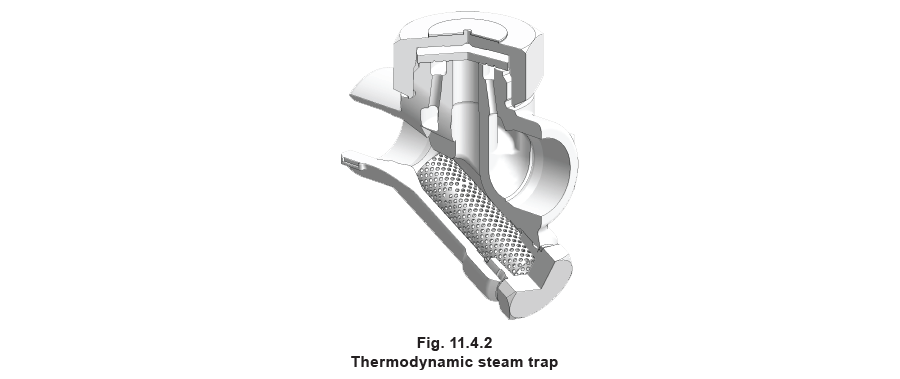 The thermodynamic trap is an extremely robust steam trap with a simple mode of operation. The trap operates by means of the dynamic effect of flash steam as it passes through the trap, as depicted in Figure 11.4.1. The only moving part is the disc above the flat face inside the control chamber or cap.