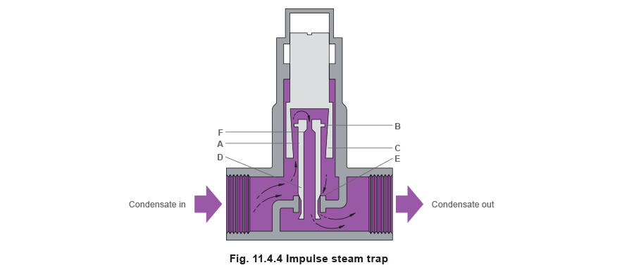 The impulse trap (as shown in Figure 11.4.4) consists of a hollow piston (A) with a piston disc (B) working inside a tapered piston (C) which acts as a guide. At 'start-up' the main valve (D) rests on the seat (E) leaving a passage of flow through the clearance between piston and cylinder and hole (F) at the top of the piston. Increasing flow of air and condensate will act on the piston disc and lift the main valve off its seat to give increased flow. Some condensate will also flow through the gap between the piston and disc, through E and away to the trap outlet.