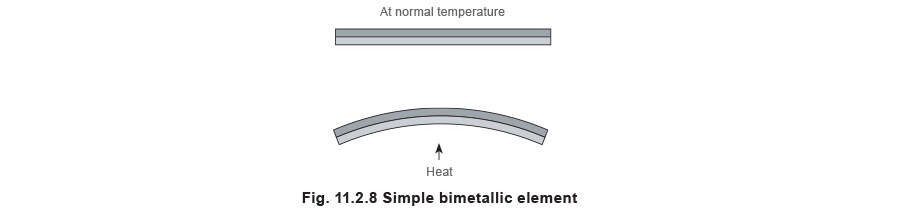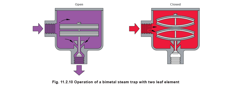 As the name implies, bimetallic steam traps are constructed using two strips of dissimilar metals welded together into one element. The element deflects when heated. (Figure 11.2.8):