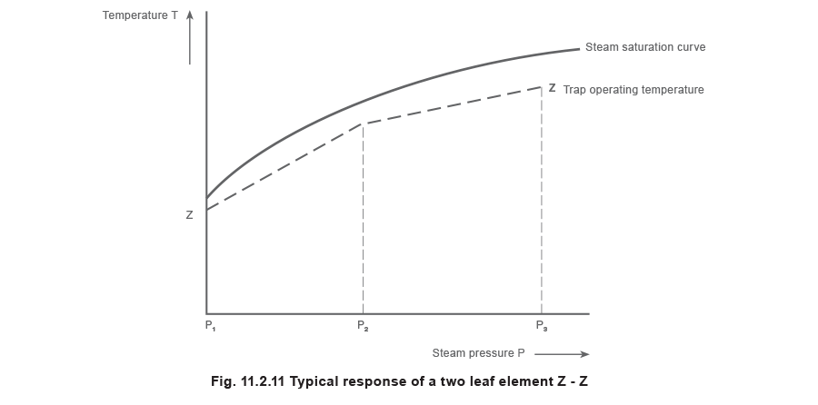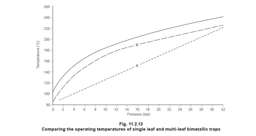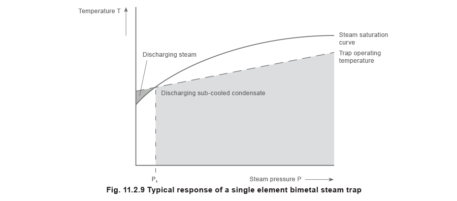 • Operation of the steam trap takes place at a certain fixed temperature, which may not satisfy the requirements of a steam system possibly operating at varying pressures and temperatures (see Figure 11.2.9).