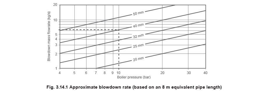 In the unlikely event that the total equivalent length is less than 7.5 m, the vessel should be sized on a higher flowrate. In these cases, multiply the boiler pressure by 1.15 to calculate the blowdown rate from Figure 3.14.1. Blowdown lines over 7.5 m can be read straight from this graph.