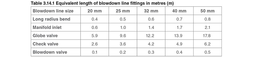 In practice, a reasonable minimum length of blowdown line is 7.5 m, and most blowdown vessels are sized on this basis. Blowdown lines will contain bends, check valves and the blowdown valve itself; and these fittings will increase the pressure drop along the blowdown line. They may be thought of in terms of an ‘equivalent straight length of pipe’, and can be added to the pipe length to give an overall equivalent length. Table 3.14.1 gives equivalent lengths of various valves and fittings.