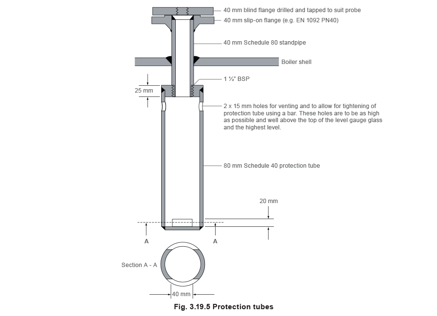 The protection tubes themselves are not standard items, and will be uniquely manufactured for each individual boiler. However, because the design of the protection tubes can have such a major effect on the successful operation of the level controls, the following provide some guidance for their design and installation: