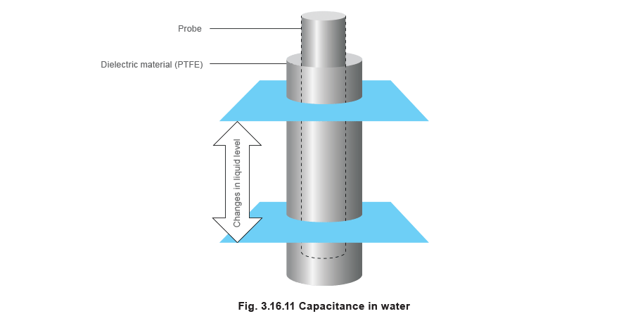 Since the distance between the two capacitance plates above the water surface (the chamber wall and the probe) is large, so the capacitance CA is small (see Equation 3.16.2). Conversely, the distance between the plates below the water surface (the probe and the water itself) is small and therefore, the capacitance CB will be large compared with CA. The net result is that any rise in the water level will cause an increase in capacitance that can be measured by an appropriate device.