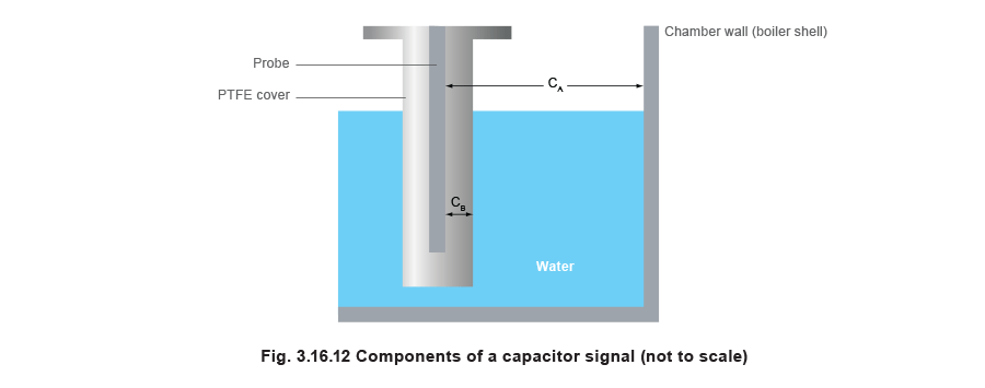 The capacitance level probe therefore consists of a conducting, cylindrical probe, which acts as the first capacitor plate. This probe is covered by a suitable dielectric material, typically PTFE. The second capacitor plate is formed by the chamber wall (in the case of a boiler, the boiler shell) together with the water contained in the chamber. Therefore, by changing the water level, the area of the second capacitor plate changes, which affects the overall capacitance of the system (see Equation 3.16.2).