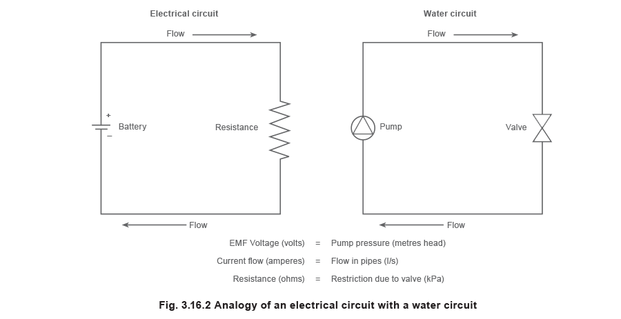 The way in which electricity flows can be compared with a liquid. Liquid flows through a pipe in a similar way that electricity flows through a conductor (see Figure 3.16.2).
