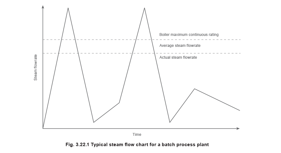 Figure 3.22.1, shows that in each case the demands are almost instantaneous and the peaks are well above the average load. The result of a sudden demand on boiler plant is a pressure drop in the boiler, because the boiler and its associated combustion equipment are unable to generate steam at the rate at which it is being drawn off.