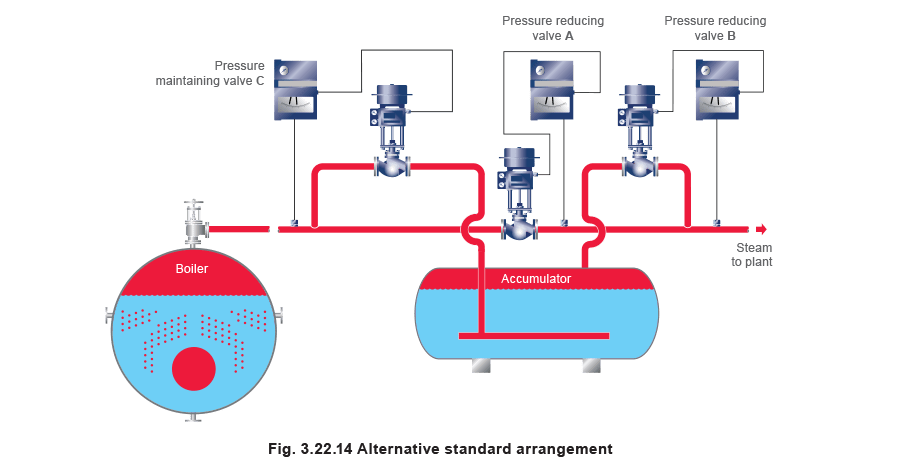 Valve C is a pressure-maintaining valve, responding to the boiler pressure. If the pressure rises because of reduced demand from the plant, pressure-maintaining valve C opens. Steam is then admitted to the steam accumulator that is recharged towards its maximum pressure, a little below boiler pressure. Pressure reducing valve B will be closed at this time because the plant is receiving sufficient steam through the (partially closed) pressure reducing valve A.