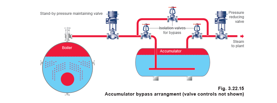 This will include the provision of adequate and safe isolation of the accumulator with valves, and perhaps some means of protecting the boiler from overload if large changes in demand cannot be avoided. The most obvious solution here is a stand-by pressure-maintaining valve.