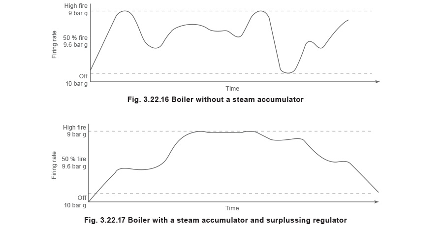 The steam accumulator and pressure maintaining valve together protect the boiler from overload conditions and allow the boiler to operate properly up to its design rating. This is important to achieve good efficiencies and at the same time to supply clean, dry, saturated steam. Figures 3.22.16 and 3.22.17 illustrate respectively the firing rate without a steam accumulator and the firing rate with a steam accumulator.