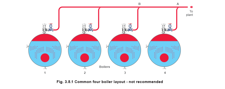 Flow depends on pressure drop, it follows then, that boiler number 4 will discharge more steam into the common header than boiler number 3. Likewise, boiler number 3 will discharge more than number 2, and so on. The net effect is that if boiler number 1 is fully loaded, the other boilers are progressively overloaded, the effect worsening nearer to the final off-take.