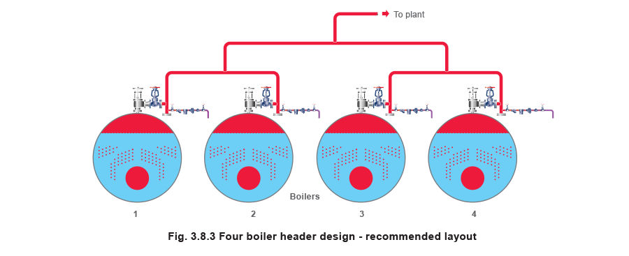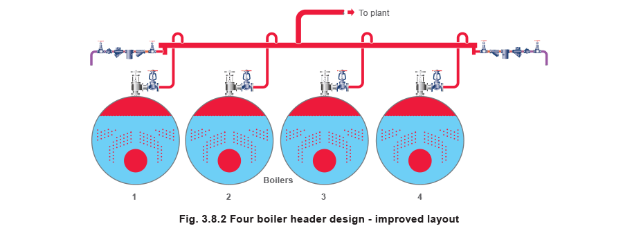 The aim should be that the pressure drops between each boiler outlet and the header off-take to the plant should be within 0.1 bar. This will minimise carryover and help to prevent overload and lockout of boilers.