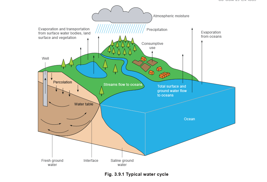 This small proportion would soon be consumed if it were not for the water cycle (see Figure 3.9.1). After evaporation, the water turns into clouds, which are partly condensed during their journey and then fall to earth as rain. However, it is wrong to assume that rainwater is pure; during its fall to earth it will pick up impurities such as carbonic acid, nitrogen and, in industrial areas, sulphur dioxide.
